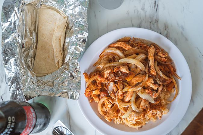 Seasoned Chicken grilled with onion and pineapple served on top of fresh Mexican rice and covered with queso dip with 3 tortillas on the side.
