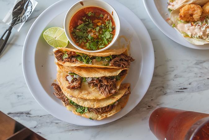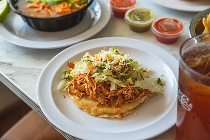 2 handmade corn tortillas grilled stacked with cheese inside and topped with your choice of meat and toppings.