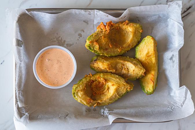 A whole fresh avocado sliced and breaded with tempera breading. Served with chipotle sauce.